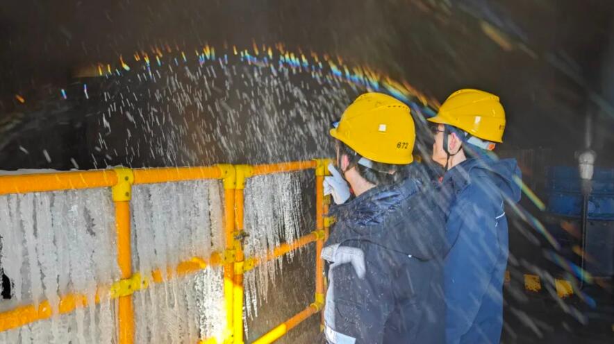 周寧抽蓄公司及時(shí)發(fā)布降溫、冰凍、雨雪等預(yù)警信息和風(fēng)險(xiǎn)提示,一線人員堅(jiān)守崗位,對(duì)戶外管道電纜、電氣配電柜等設(shè)備進(jìn)行防凍檢查和增加掃雪頻次,確保大型“充電寶”輸出汩汩綠色電能。邵武能源公司迎“寒”而上,強(qiáng)化燃煤保障,一線人員在零下6度、雪花漫天飛舞的戶外,對(duì)伴熱蒸汽管道、升壓站、冷卻塔等設(shè)備開展全方位防寒防凍專項(xiàng)檢查。海拔1348米的寧化雞公崠風(fēng)電場(chǎng)最高積雪達(dá)到20厘米,該場(chǎng)站迅速啟動(dòng)防極端天氣應(yīng)急預(yù)案,提前預(yù)置應(yīng)急力量,運(yùn)用“無人機(jī)+視頻監(jiān)控+人工特巡”的立體化方式,開展風(fēng)機(jī)、線路、升壓站的覆冰積雪情況檢測(cè)。