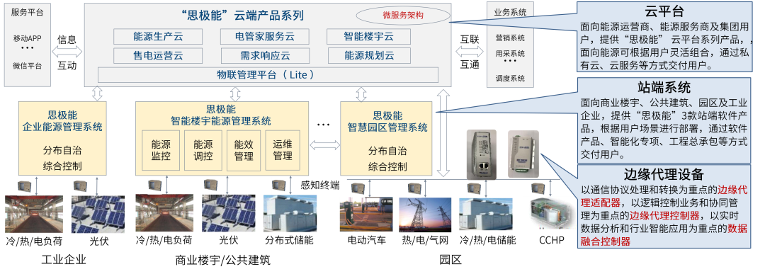 國網(wǎng)信通產(chǎn)業(yè)集團依托“云-網(wǎng)-邊-端-芯-智-鏈”的信息通信全產(chǎn)業(yè)鏈體系,開發(fā)以“思極能”品牌為核心的智慧能源服務(wù)軟硬件產(chǎn)品,滿足能源運營商/服務(wù)商、能源消費者、能源產(chǎn)品商、政府等多元化用戶的綜合能源需求,打造智慧樓宇、智慧園區(qū)等典型CPS(信息物理系統(tǒng))場景的“智腦+神經(jīng)系統(tǒng)”,實現(xiàn)客戶側(cè)能源系統(tǒng)的安全、高效、低碳運行。
