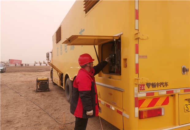 開工儀式當(dāng)天沙塵天氣持續(xù),揚沙隨風(fēng)彌漫,突擊隊的保電人員不辭辛苦一大早便提前進(jìn)入會場。將發(fā)電車??吭谇捌诓榭钡闹付ㄎ恢茫龊冒踩O(jiān)護(hù)相關(guān)的工作之后,啟動車輛試運行,檢查了各項儀表數(shù)據(jù),并做好與用戶側(cè)供電設(shè)備的對接,全力以赴投入保電工作。該分局領(lǐng)導(dǎo)帶領(lǐng)保電人員全程守候在現(xiàn)場,隨時應(yīng)對突發(fā)停電事故的發(fā)生,確保了開工儀式用電萬無一失。