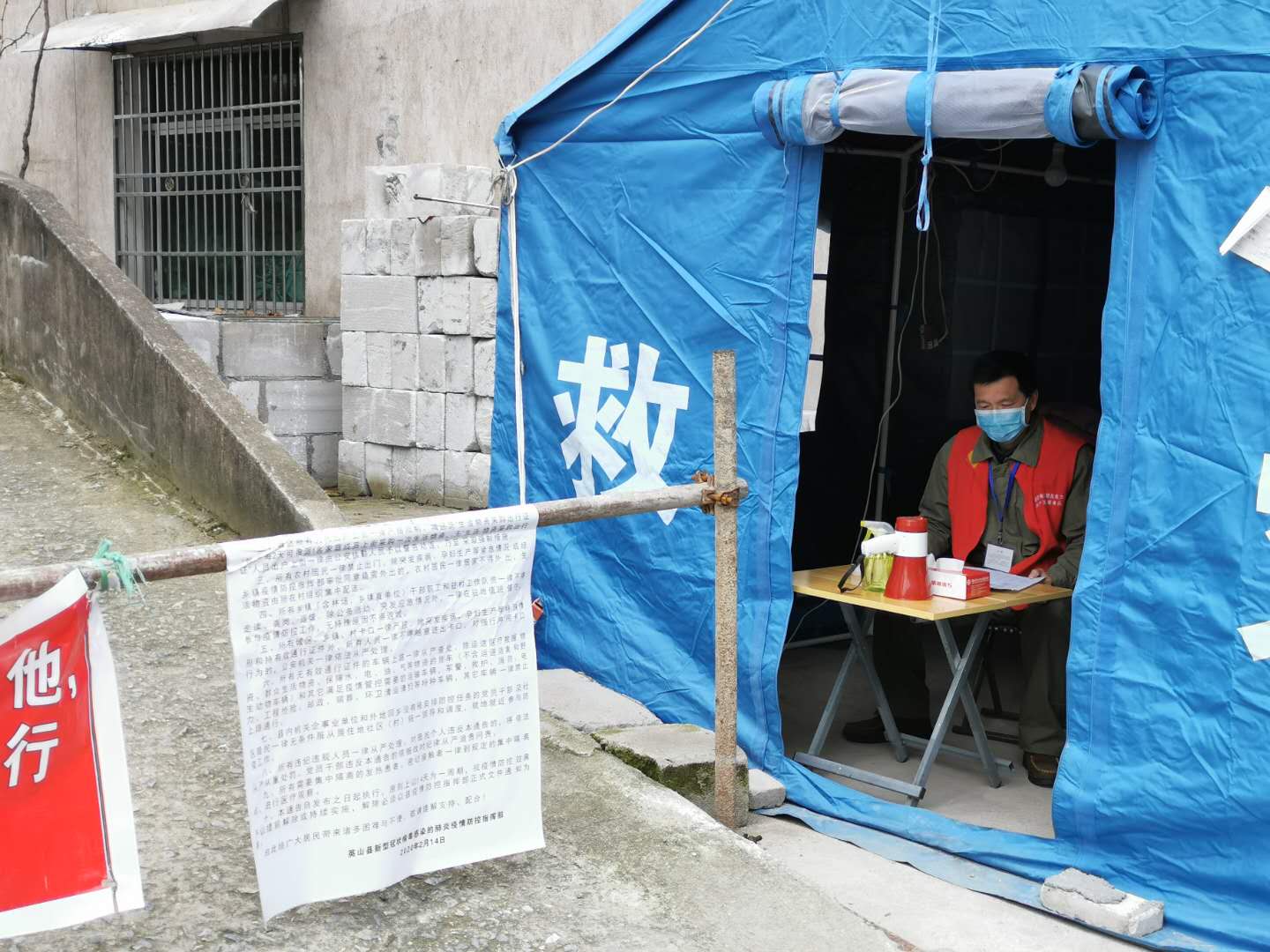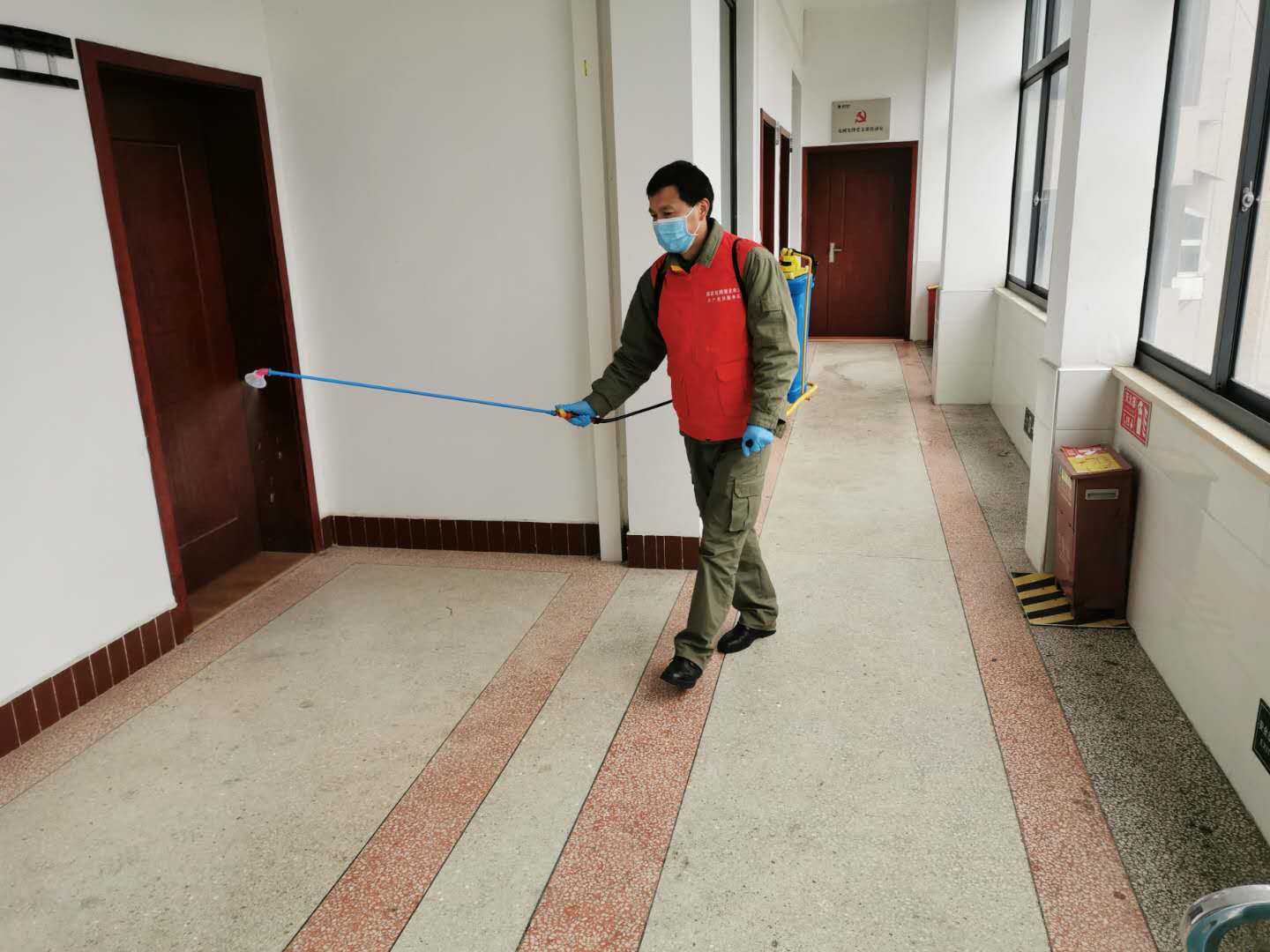 輪班消毒的值班人員搶修去了,他二話不說,背上消毒藥箱到消毒路段一棟樓地噴灑消毒。