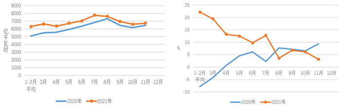 1-11月份,全國(guó)工業(yè)用電量同比增長(zhǎng)10.2%,增速同比提高8.1個(gè)百分點(diǎn)。全國(guó)制造業(yè)用電量同比增長(zhǎng)10.9%,增速同比提高8.5個(gè)百分點(diǎn)。制造業(yè)中,四大高載能行業(yè)合計(jì)用電量同比增長(zhǎng)7.4%,其中,建材行業(yè)同比增長(zhǎng)8.3%,黑色行業(yè)同比增長(zhǎng)7.7%,化工行業(yè)同比增長(zhǎng)7.4%,有色行業(yè)用電量同比增長(zhǎng)6.4%;高技術(shù)及裝備制造業(yè)合計(jì)用電同比增長(zhǎng)17.0%,其中,電氣機(jī)械和器材制造業(yè)、計(jì)算機(jī)/通信和其他電子設(shè)備制造業(yè)、通用設(shè)備制造業(yè)、儀器儀表制造業(yè)、汽車制造業(yè)同比增長(zhǎng)超過15%,分別為25.2%、21.1%、17.5%、17.1%和16.8%;消費(fèi)品制造業(yè)合計(jì)用電同比增長(zhǎng)13.6%,其中,家具制造業(yè)、紡織服裝/服飾業(yè)、文教/工美/體育和娛樂用品制造業(yè)、木材加工和木/竹/藤/棕/草制品業(yè)、皮革/毛皮/羽毛及其制品和制鞋業(yè)、紡織業(yè)同比增長(zhǎng)超過15%,分別為19.9%、18.4%、18.1%、17.8%、17.0%和16.0%。