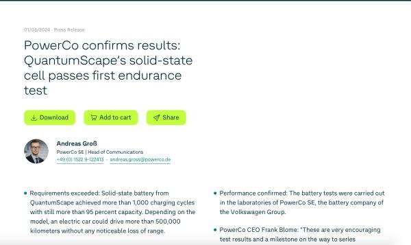 而1月3日,大眾集團(tuán)的電池子公司 PowerCo也發(fā)布了對QuantumScape 這批24 層固態(tài)電池A樣品的耐久性測試的結(jié)果報告,確認(rèn)了QuantumScape的聲明。