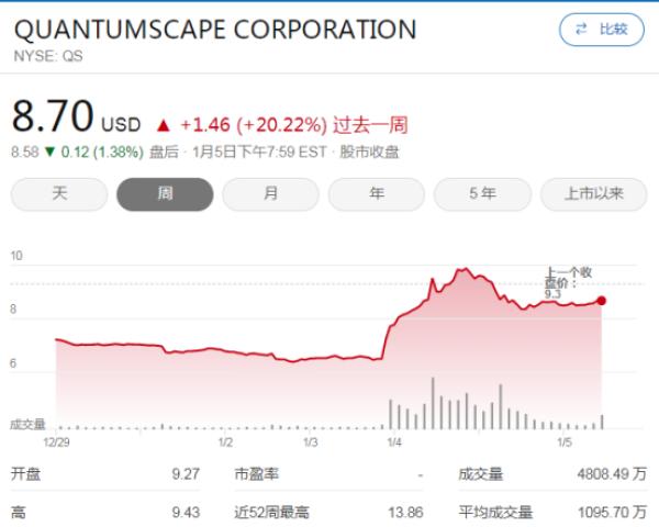 此次其固態(tài)電池通過大眾集團(tuán)方面耐久性測試的消息公布后第二日,QuantumScape股上漲 43%,收于 9.30 美元,創(chuàng)下 8 月以來的最高收盤價。盤中上漲約54%。該股在過去52周內(nèi)上漲了 72%,但較 2020 年 12 月創(chuàng)下的歷史高點(diǎn)下跌 93%。