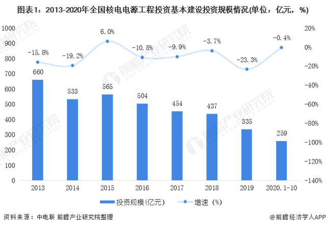 受到福島核電站等事故的影響,我國核電建設雖然處在高速發(fā)展期,但是保持著以“穩(wěn)”為主的基調(diào),新開工機組數(shù)量較少,核電工程投資額有所下滑。根據(jù)中國電力企業(yè)聯(lián)合會的統(tǒng)計數(shù)據(jù)顯示,2020年1-10月,全國主要核電企業(yè)電源工程完成投資259億元,同比下降0.4%。