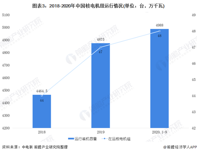 截至2019年底,中國在運核電機組共47臺,分別位于8個沿海省份的13個核電基地中,運行裝機容量達到4875萬千瓦,位居世界第三,占全國總裝機容量的2.5%左右。截止2020年9月底,中國在運核電機組48臺,總裝機容量4988萬千瓦。
