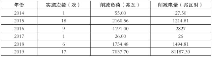 在需求響應(yīng)實(shí)施早期,實(shí)施目的主要是為了應(yīng)對(duì)夏季高峰時(shí)段電力消費(fèi)緊張狀況,最大程度削減高峰電力負(fù)荷對(duì)電網(wǎng)安全的影響,保障了民生用電和重點(diǎn)用電安全平穩(wěn)。2014~2019年度國(guó)內(nèi)開(kāi)展削峰需求響應(yīng)的情況如下表所示。
